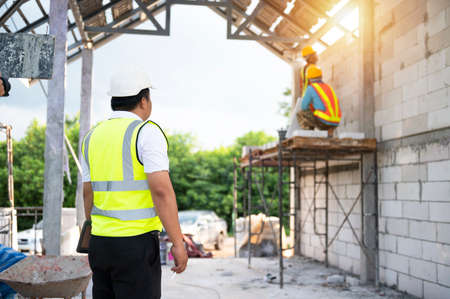 Engineers and architects supervise the construction of houses on residential construction sites.