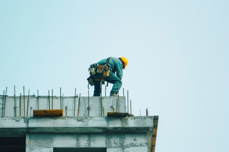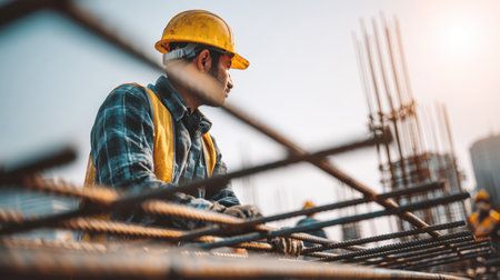 A focused worker in protective gear is tying rebar to build a steel frame for a concrete structure. This image shows the hard work and teamwork involved in a construction project.