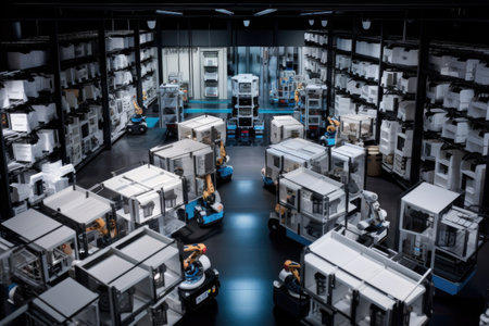 3d printing warehouse, with dozens of robots moving around and bringing products to life, created with generative ai