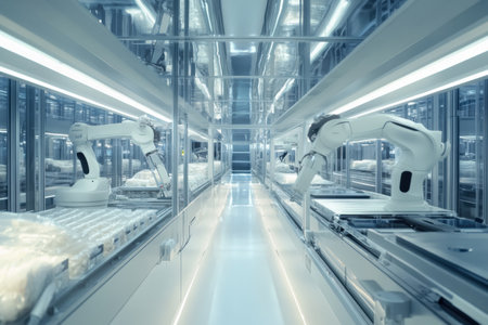 Futuristic industrial robotic arms managing high-precision tasks in a cleanroom environment, cyber-tech automation with copy space.
