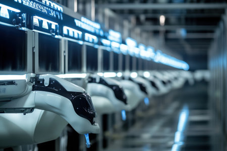 Robotic arms perform automated tasks on an assembly line. The scene showcases industrial technology within a manufacturing setting. Bright lighting illuminates the machinery and products, emphasizing the technological processes. This image is suitable for various commercial purposes, including illustrating automation or industrial advancement.