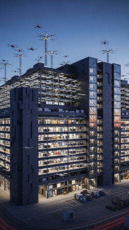 High-angle shot of a multi-story automated drone delivery hub at dusk. Numerous autonomous drones vertically dock, showcasing efficiency and future logistics.