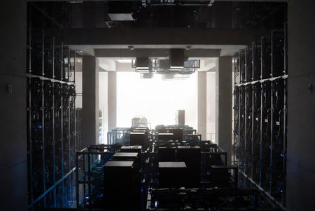 A dimly lit industrial interior with rows of machinery and blue lighting