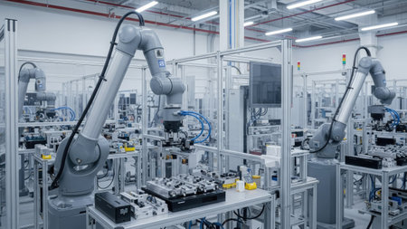 Robotic arms perform tasks within a modern industrial facility, the scene captured with bright lighting. The arms are silver and gray, interacting with metallic components. The composition showcases a high-tech environment. This image is suitable for illustrating innovation and automated processes.
