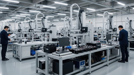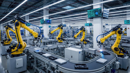 Automated industrial robots assemble electronic devices with precision., generative AI