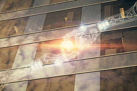 Data theme hologram drawing on city view with skyscrapers background multi exposure. Bigdata concept.