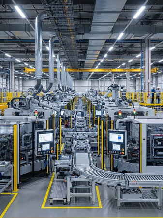 Explore an advanced industrial factory with automated machinery and production lines in action. This image captures the essence of modern manufacturing and technology.