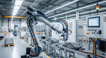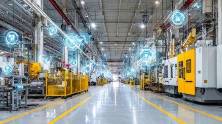 Explore a high-tech factory interior featuring advanced machinery and digital interfaces that enhance production efficiency in modern manufacturing environments.