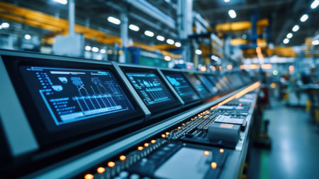 A detailed view of a high-tech control panel featuring multiple display screens and buttons within a modern manufacturing environment emphasizing efficiency and innovation.