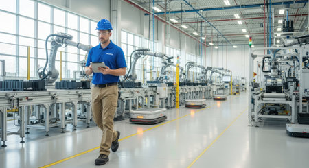 A busy, modern factory floor filled with automated robotic arms, conveyor belts, and AGVs moving along designated paths, showcasing advanced manufacturing processes.