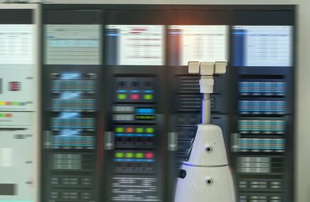 Automation technology and smart industry concept on blurred abstract background. Gears and icons.