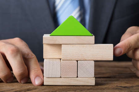 Real Estate Market Growth Concept. businessman or a home or real estate broker. taxes and profits. Wooden cube block puzzle with pictures at home