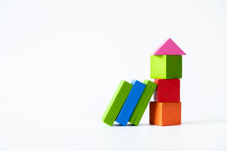 Colorful wooden toy blocks stacked vertically to resemble a house, with additional green and blue blocks leaning sideways, all isolated on a white background.