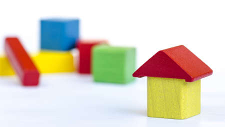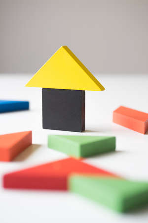 House shape from wooden rectangles on a white background. The concept of building or purchasing your own home. Children's fantasy or game