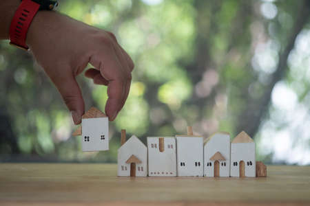 Close up of hand choosing wood house from a row model on wood table. Mortgage and real estate property investment