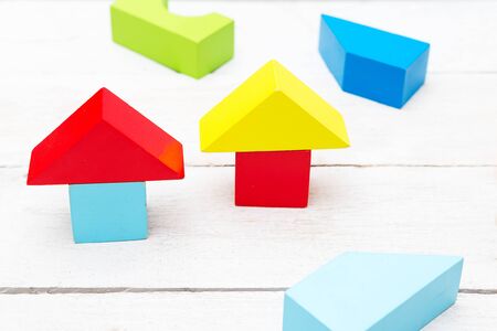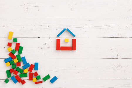 Top view on wooden colorful bricks on a white wooden background. Different-colored wooden blocks are assembled in the shape of a house. School, education and learning concept.