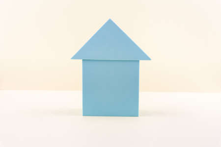 Blue house on a light background. Universal template in neutral colors. Minimalism concept. Real estate, purchase and sale of housing, mortgage, rent. Home insurance. Copy space.