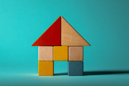 An imaginative composition of multicolored wooden pieces forming a cozy shelter, set against a lively teal backdrop that embodies creativity and fundamental ideas.