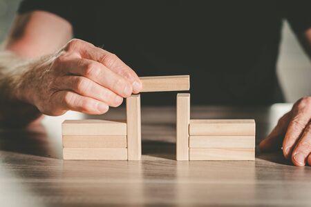 Hands building a wooden block bridge; concept of business association