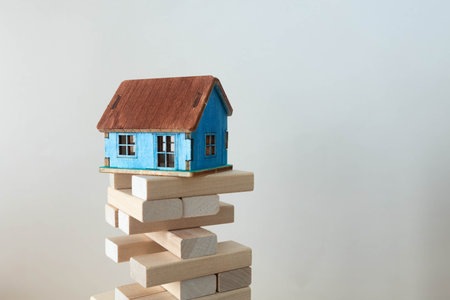 Small house made of wooden blocks on a blue background. Suitable for an article or advertisement on the topic of real estate, insurance, rent or sale.