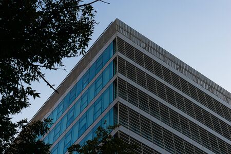 Modern high-rise building against the blue sky. Bottom view of a skyscraper in the business district. Low angle view of the glass facade of an office building