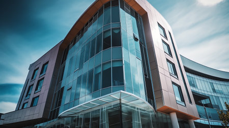 A contemporary building exterior is presented from a low-angle perspective, emphasizing its geometric design. The facade features a grid of windows reflecting the surrounding environment. The composition is bathed in natural light, with a visible blue sky. Suitable for illustrating architectural concepts, business imagery, or editorial content.