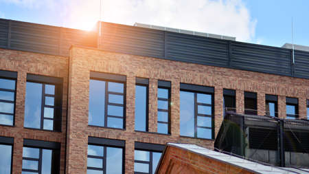 Modern building in the city with sunlight. Glass wall of an office building in the sunlight. Office building window close up with sunrise, reflection and perspective.