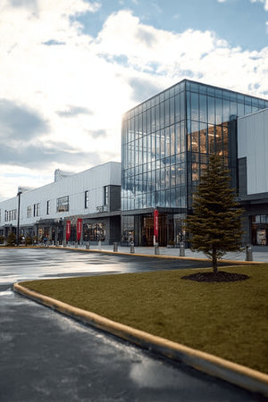 Exterior View of a Modern Shopping Center Building Featuring a Glass Tower and Urban Infrastructure