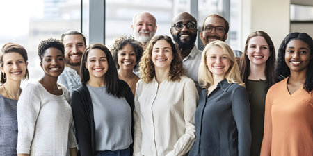 A diverse group of professionals stands confidently in an office environment, dressed in business attire. High quality photo