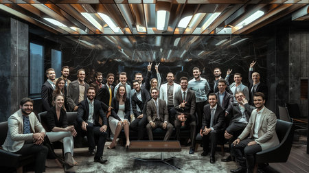 Business Team Smiling in Modern Lobby, Dressed in Suits, Representing Teamwork and Leadership