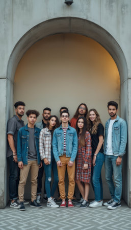 This vibrant ensemble of ten young adults, showcasing a mix of ethnicities and styles, stands together under a striking archway. Their fashionable outfits and relaxed demeanor radiate a sense of camaraderie and youthful energy, inviting viewers to connect with their dynamic personalities