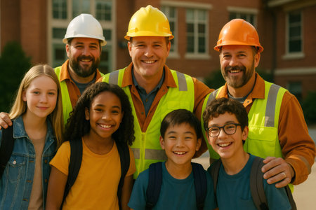 Construction workers standing with happy diverse students, smiling together in front of a school building, symbolizing community collaboration