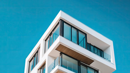 A stunning view of a modern building showcasing minimalist design with a concrete structure and glass balcony against a vibrant blue sky, highlighting architectural elegance.