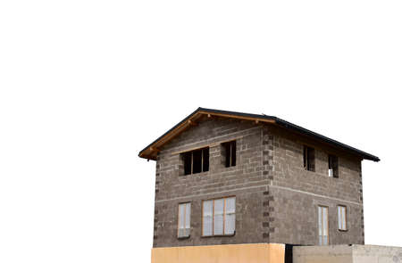 Wooden model of house from blocks. Place for your text. White background.