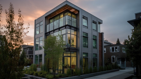 Sharp, angular rooflines with a sleek metal finish. AI generated illustration