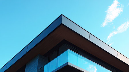 A modern house fragment featuring a cantilevered roof and clean, sharp lines, with the sky reflected in large glass windows below.