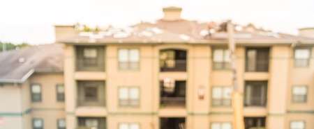 Panoramic view blurry background roof replacement in progress at apartment building in USA