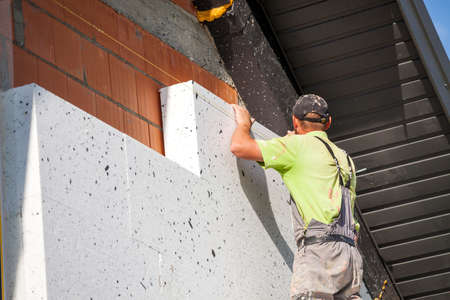 Worker placing sheet insulation to the wall at construction site Rigid extruded polystyrene insulation board for energy saving Of Facade house renovation energy efficient
