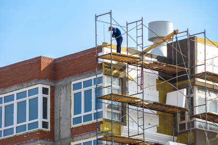 Thermal insulation of the facade of a multi storey apartment building with thick rock mineral wool slabs using scaffold, blue sky background