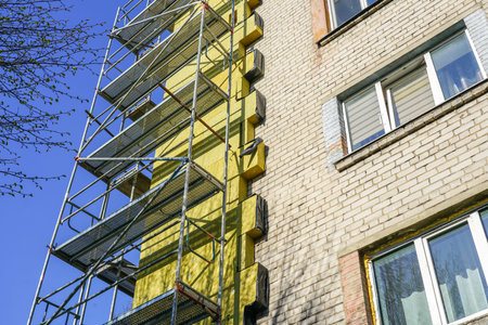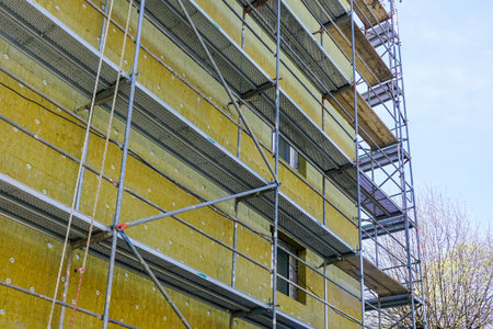 Mineral wool house insulation. Construction site with scaffolding and high-density slab insulation product installation on building facade. Selective focus.