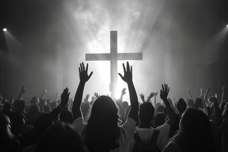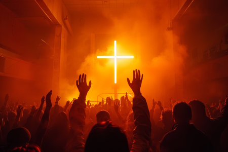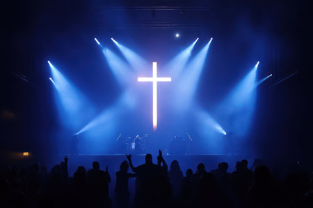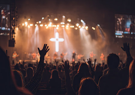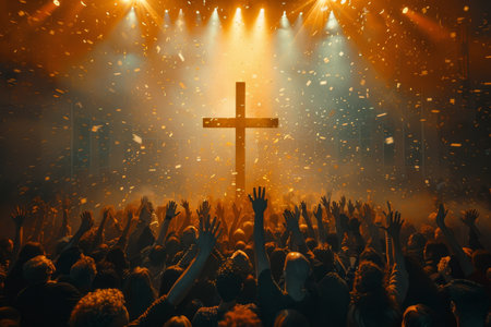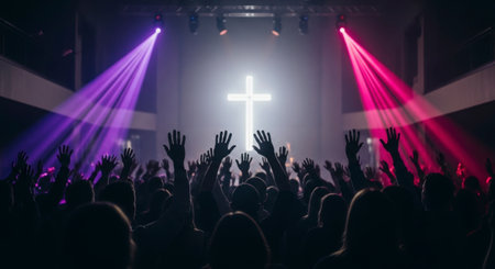 An event showcases a diverse group of people raising their hands. A large, illuminated cross stands as the central focus of a brightly lit stage with various lights. The scene suggests an indoor environment. Suitable for a variety of visual content related to gatherings, celebrations, and religious themes.