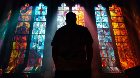 Man admiring colorful stained glass windows in a historic church during afternoon light