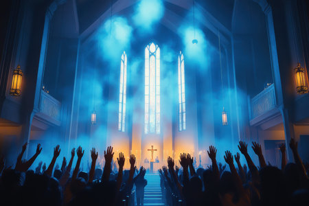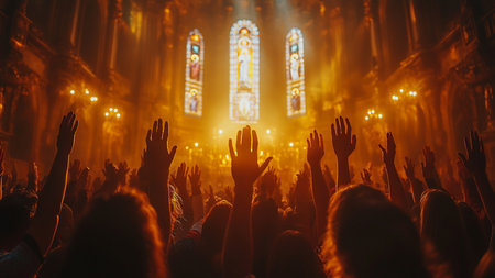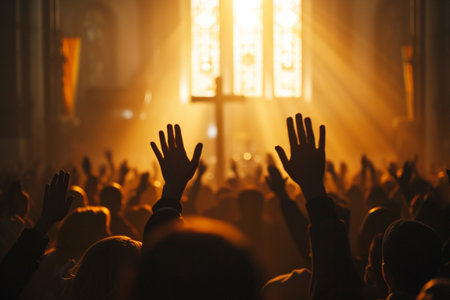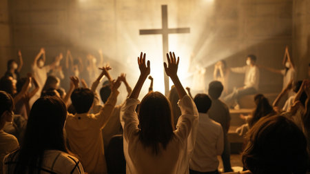 Capturing divine moments: church worship concept Christians, raised hands, earnestly pray and worship to cross in the sacred ambiance of a church building, expressing faith and spiritual connection