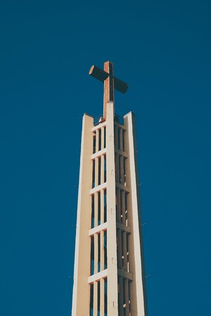 A simple yet striking image of a church steeple featuring a cross, set against a vibrant blue sky, conveying a sense of peace and spirituality.