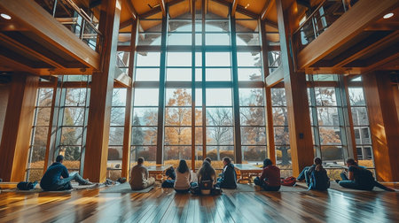 A group of individuals seated on mats in a spacious hall with striking wooden architecture and expansive windows, creating a peaceful environment perfect for meditative practice.