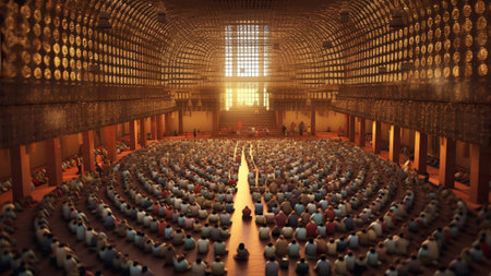Individuals are seated quietly in wooden pews, their attention directed towards the speaker at the front. Soft sunlight filters through the windows, enhancing the peaceful atmosphere.
