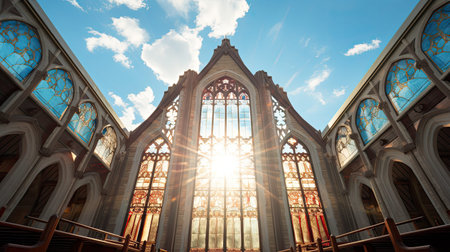 A stunning view of light filtering through intricate stained glass windows in a gothic church, creating a serene and spiritual atmosphere.