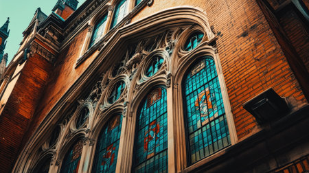 Detail of historic building with stained glass windows, spacious area for text.