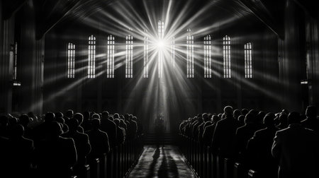 Congregation attends a church service as sunlight filters majestically through the stained glass windows, creating a serene atmosphere.