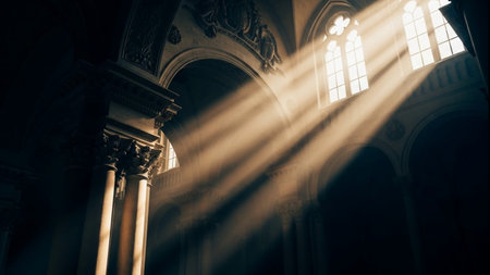 interior of a church with rays of light coming through the windows
